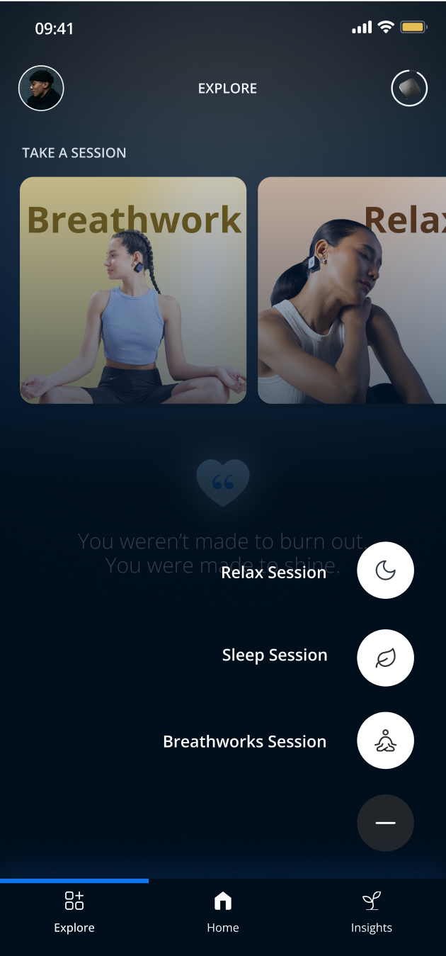 InnerGize uses encrypted Bluetooth Low Energy (BLE) for secure, reliable pairing with your phone. The app is essential to operate the device, it controls session settings, tracks progress, and syncs insights from your wearable.